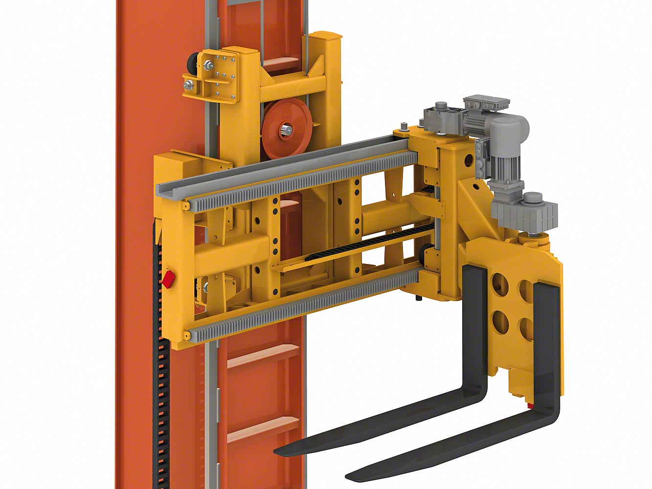堆垛机将托盘移动到通道的两端,把货物放置在托盘或自动化输送系统上。这些操作的可行性是由于使用一个旋转头,并将托盘放置在三个位置上:一个放置在前部和两个放置在侧边。