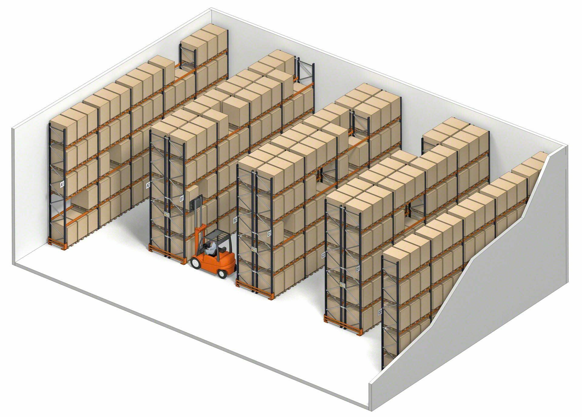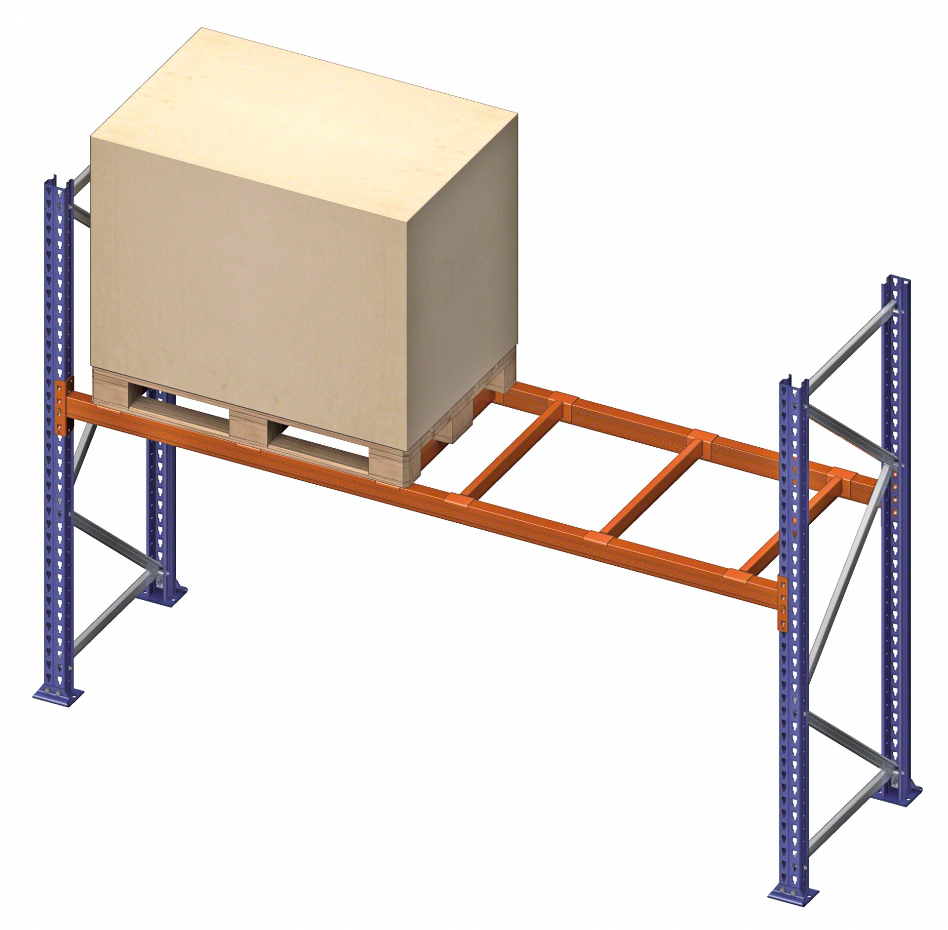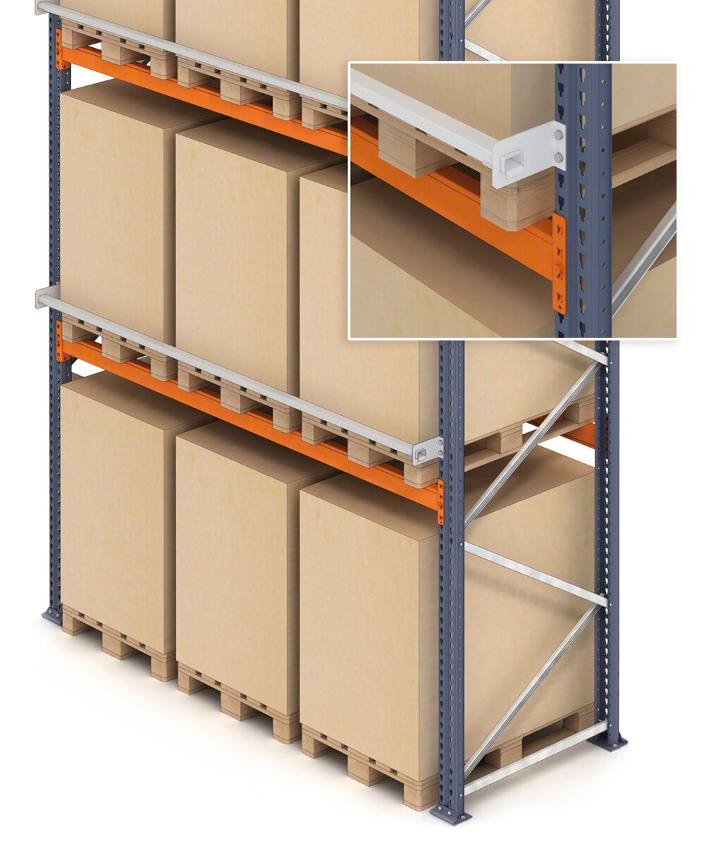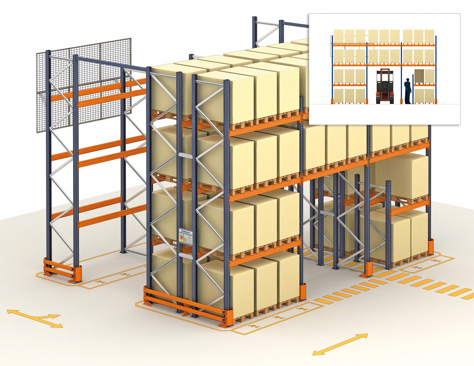 为了存储更多数量的托盘,可安装双底座的货架,在通道的两边托盘前在置放另一个托盘。