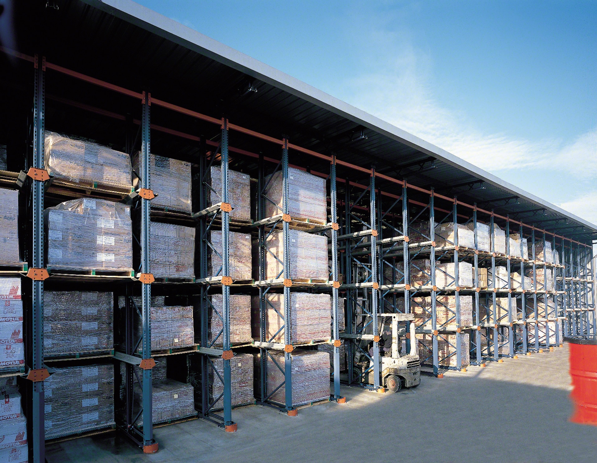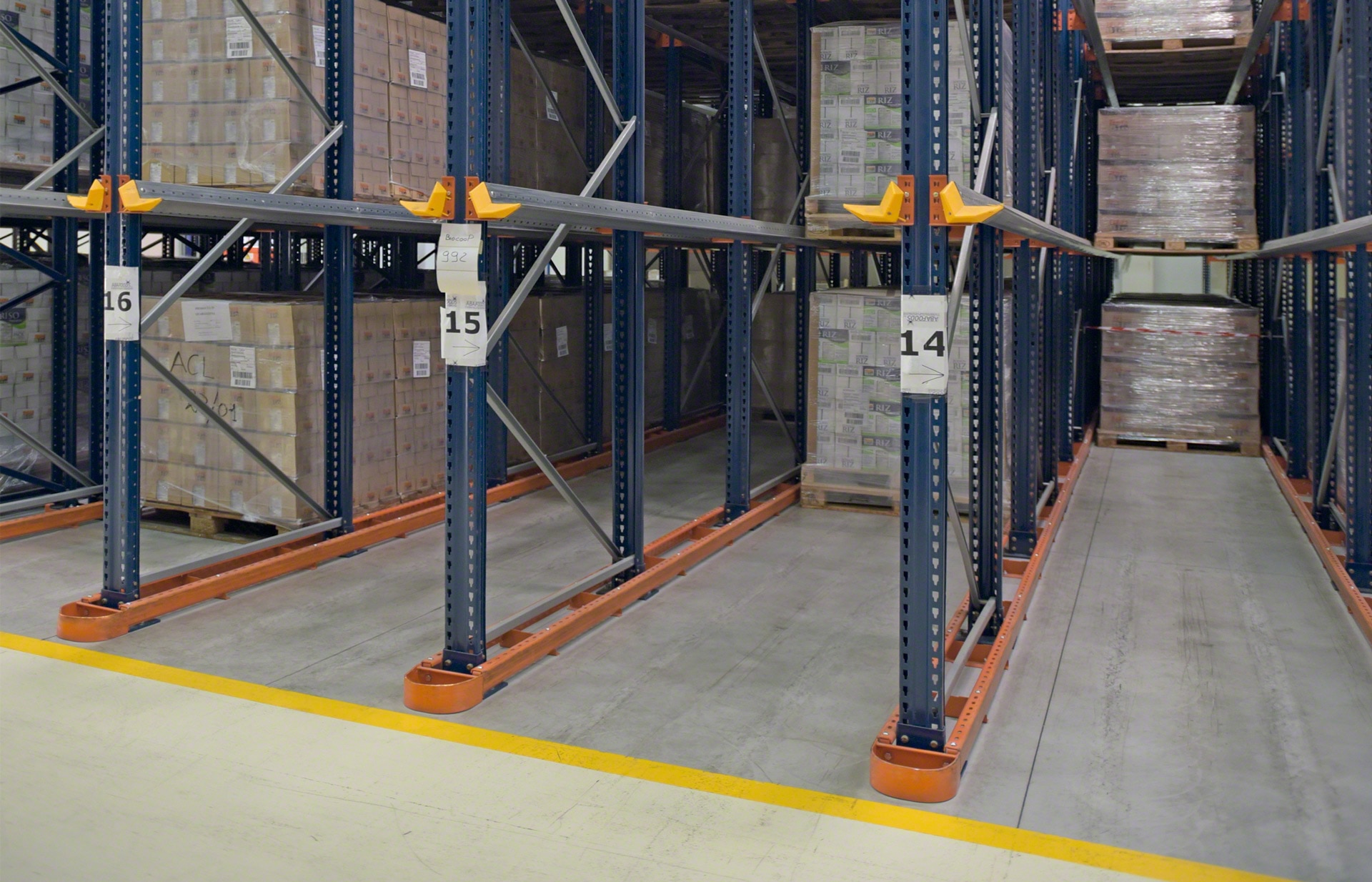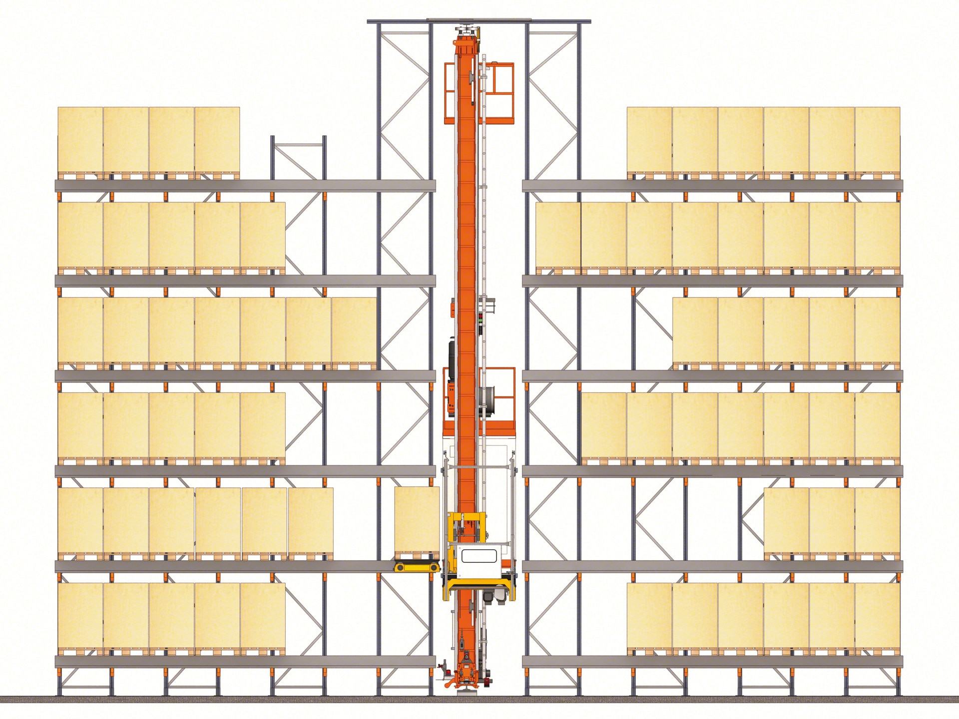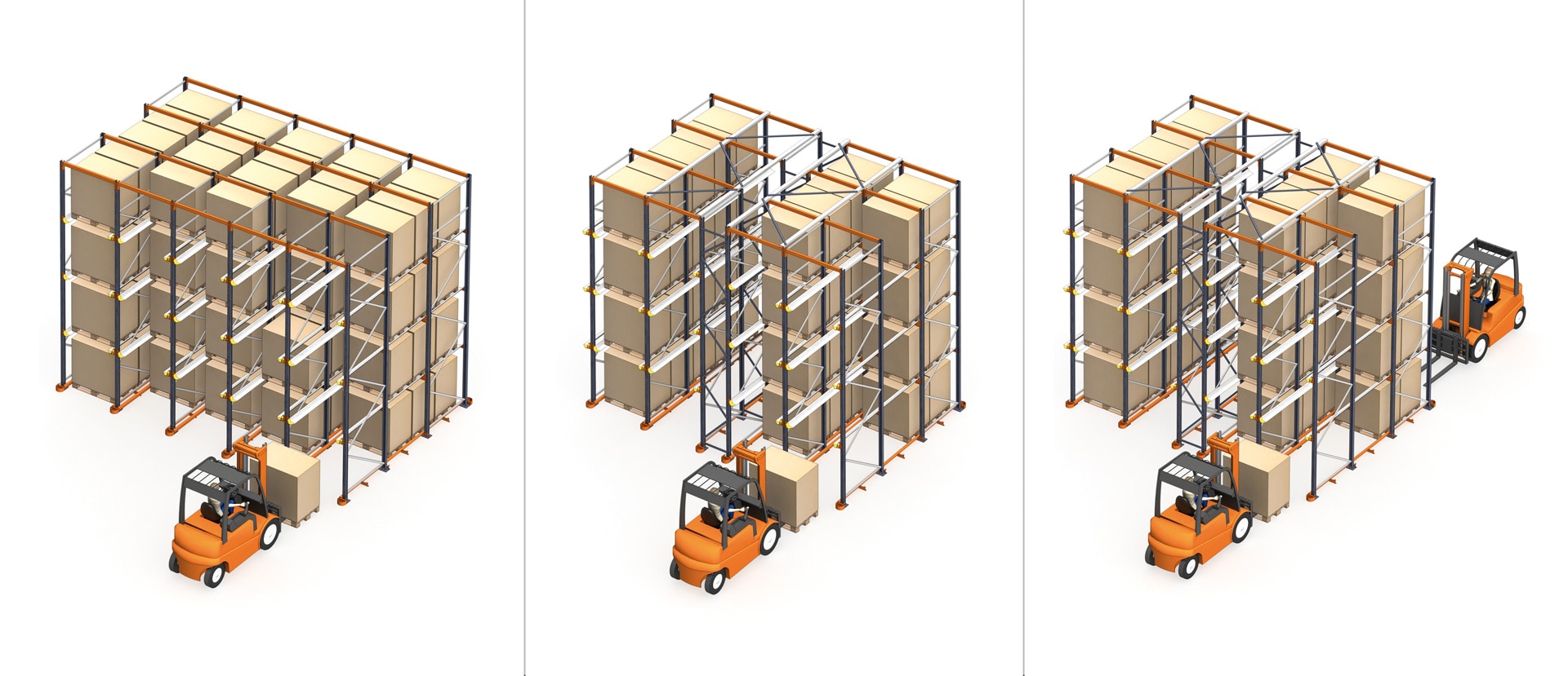 此仓储系统由一组货架组成,形成内部装载走道,而托盘使用支撑导轨。叉车进入内部街道,将装载的货物使用高于货架层的方式进入存储区。