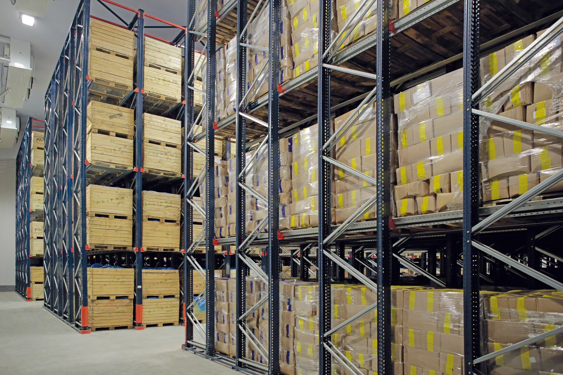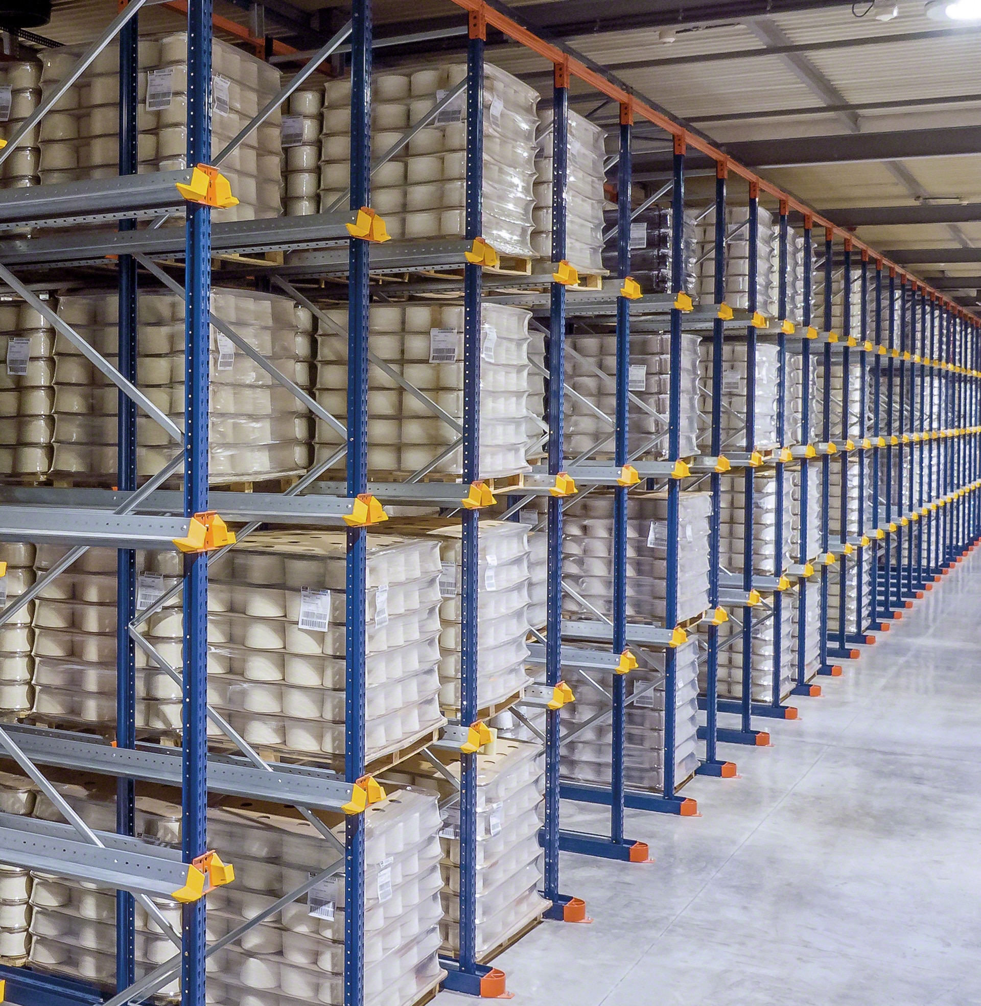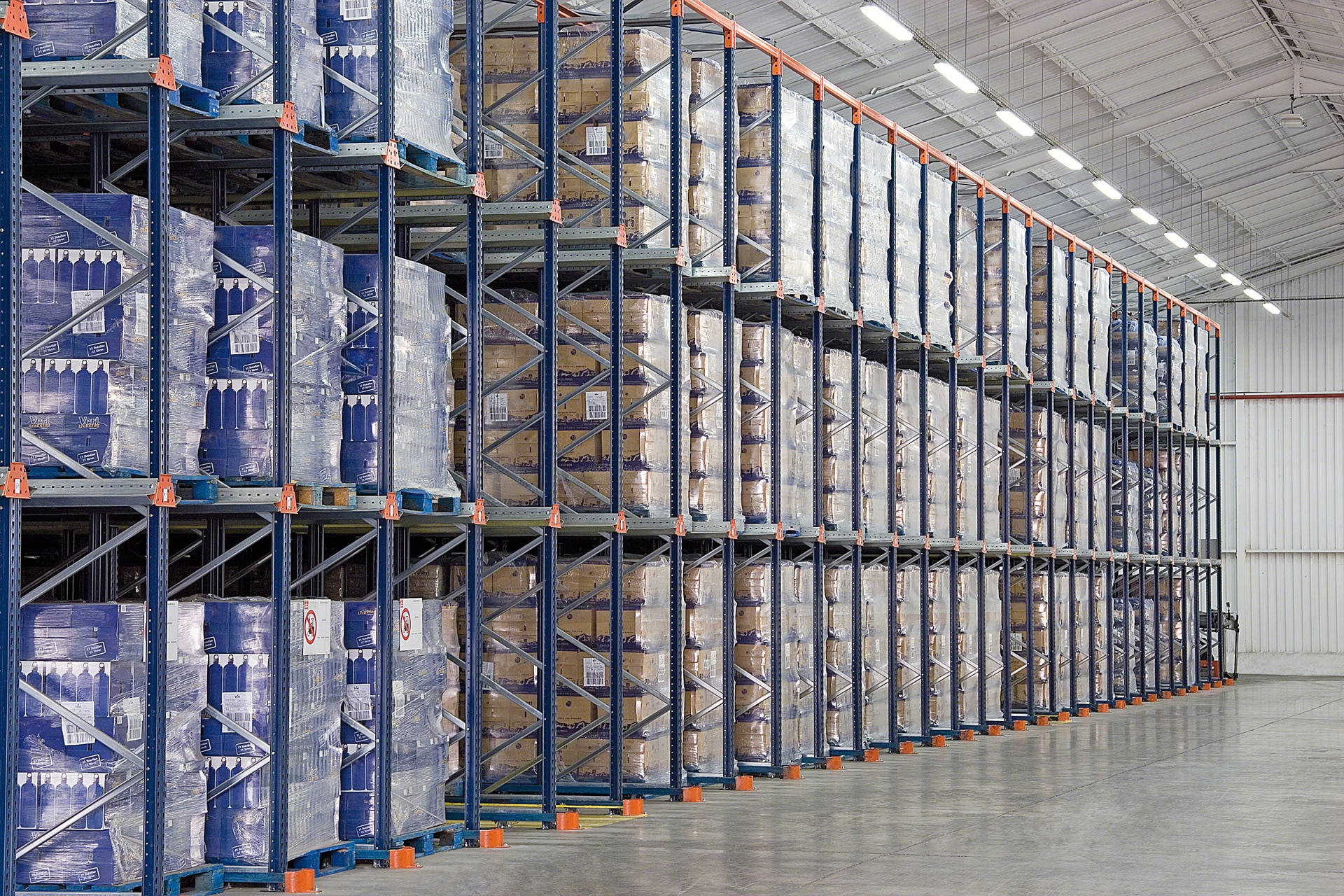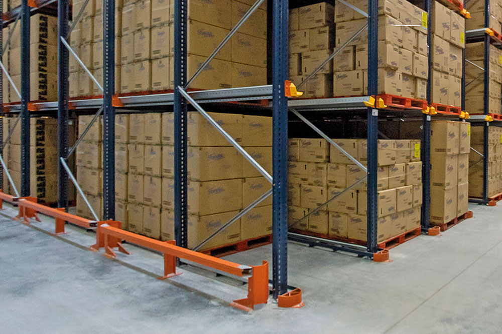此仓储系统由一组货架组成,形成内部装载走道,而托盘使用支撑导轨。叉车进入内部街道,将装载的货物使用高于货架层的方式进入存储区。