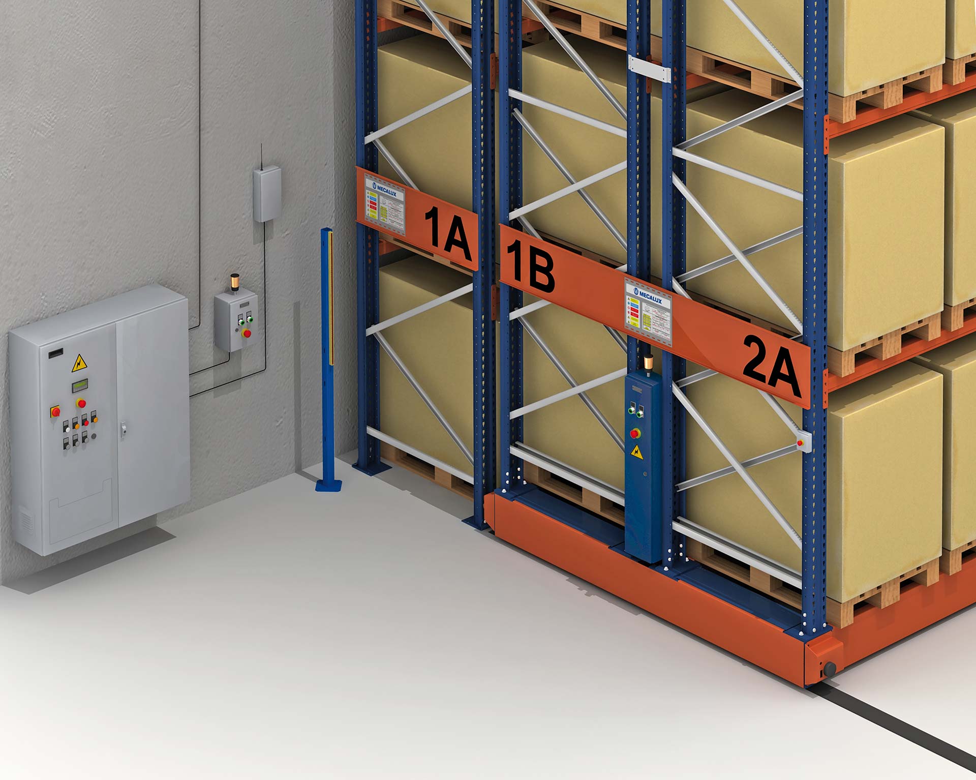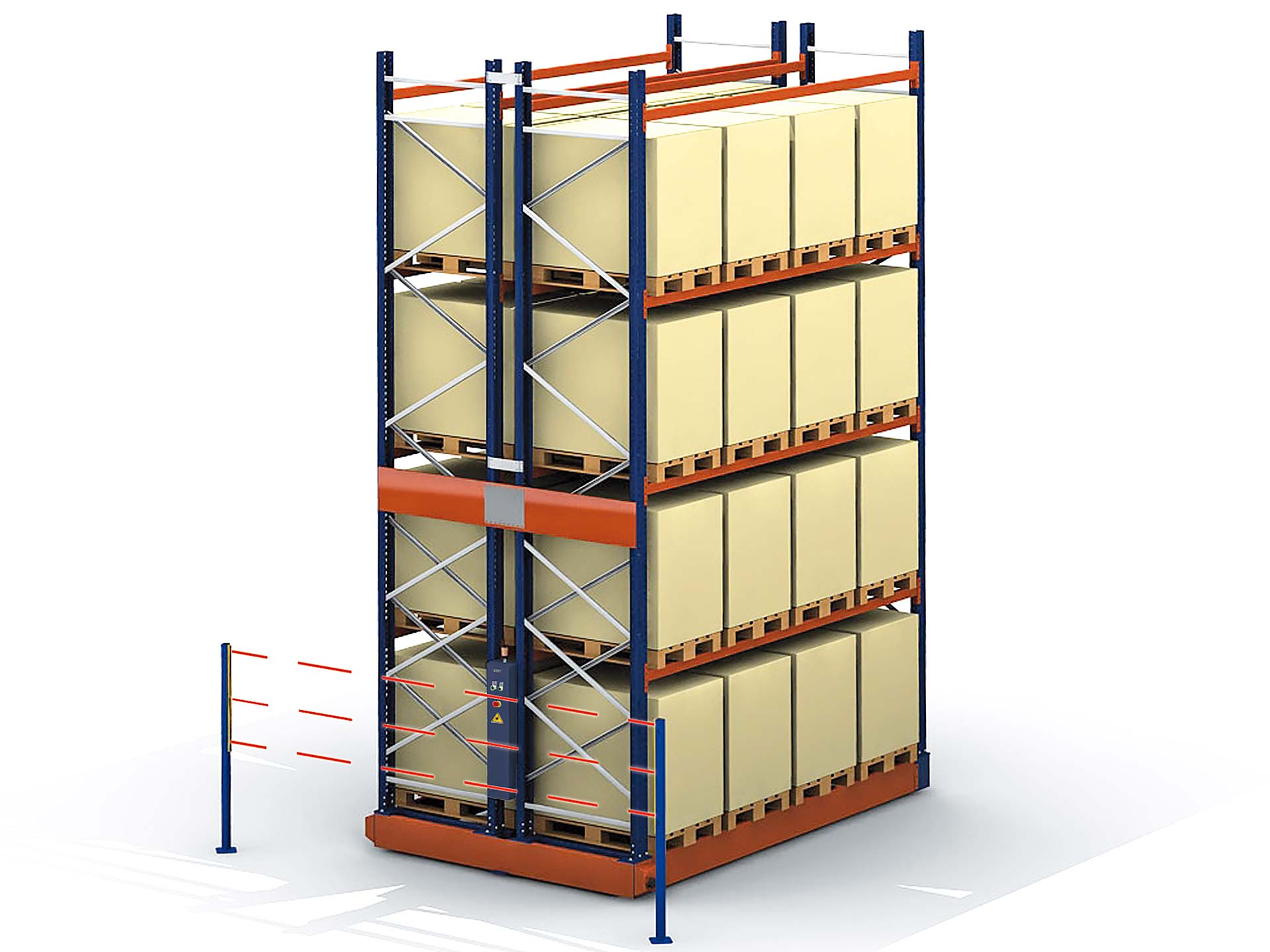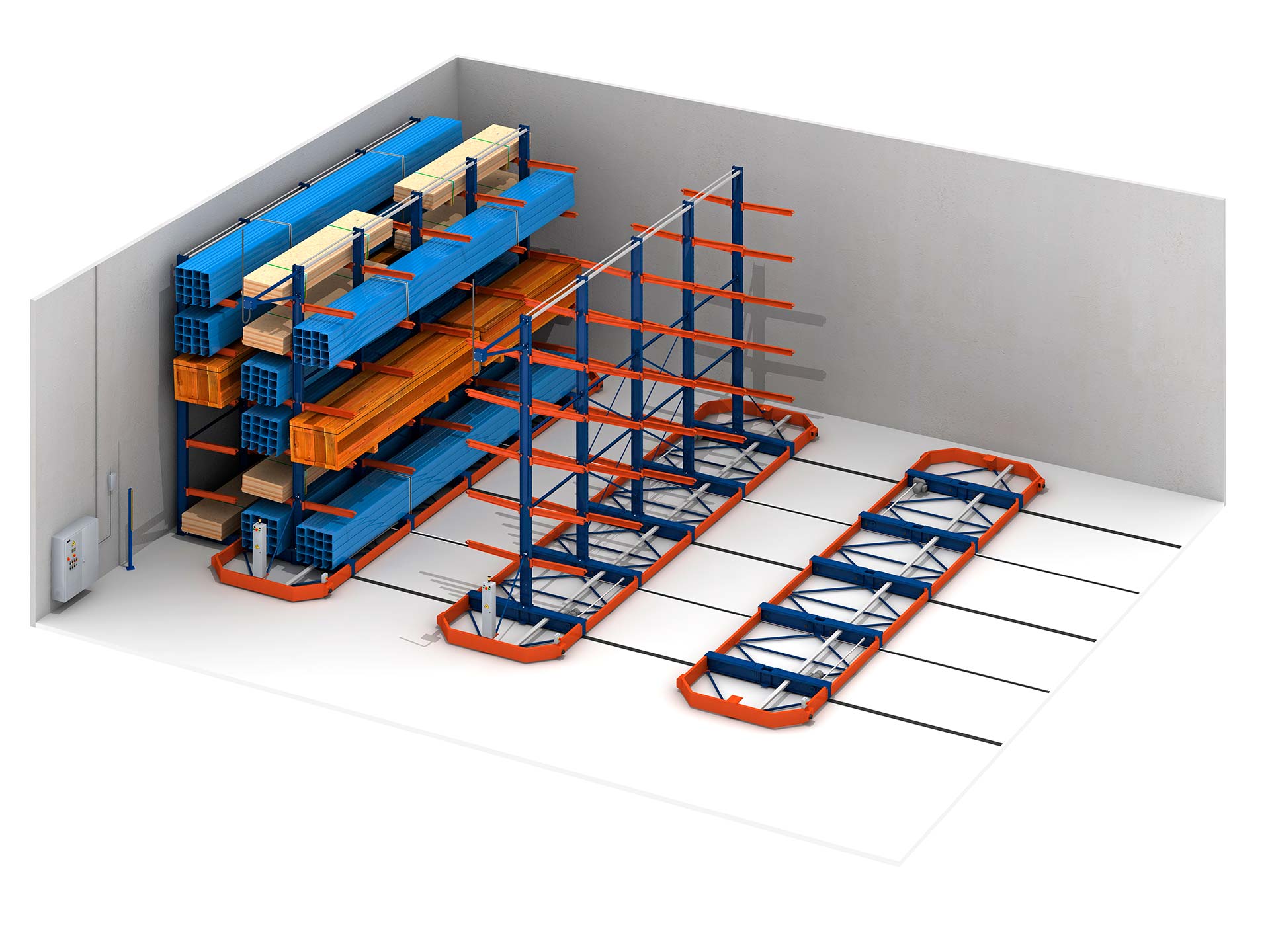 货架放置在导轨的活动底座上,以横向移动;这种方式可消除通道,并在工作时打开所需货架的通道即可。由操作者通过遥控或手动按下开关器以进行自动开启。