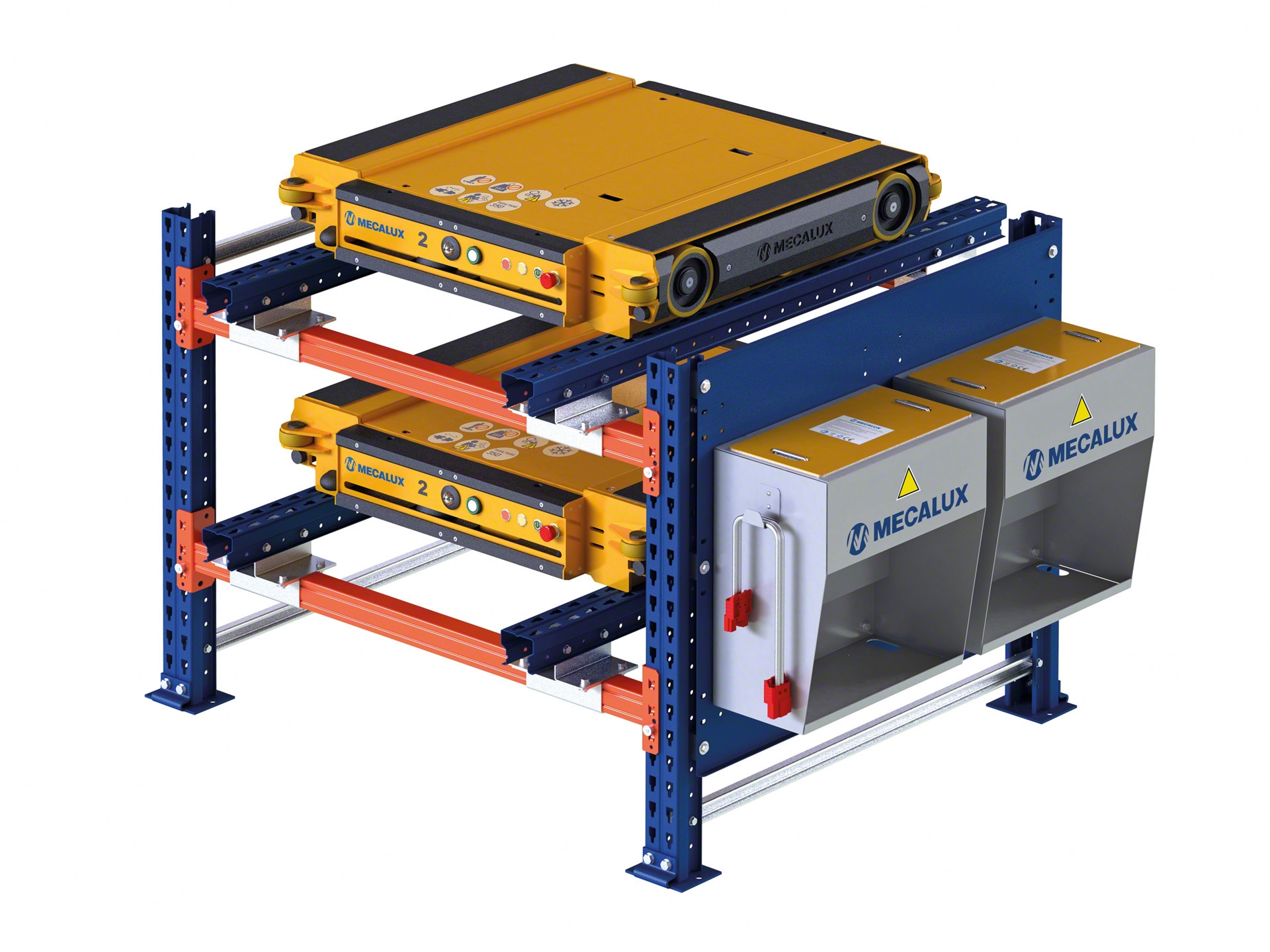 高密度的半自动化仓储系统,可使用电动车轻易地进行货物的装载和卸载,称为无线电控穿梭车。可在货架内部独立地运行,不需要使用叉车进入存储的内部走道。